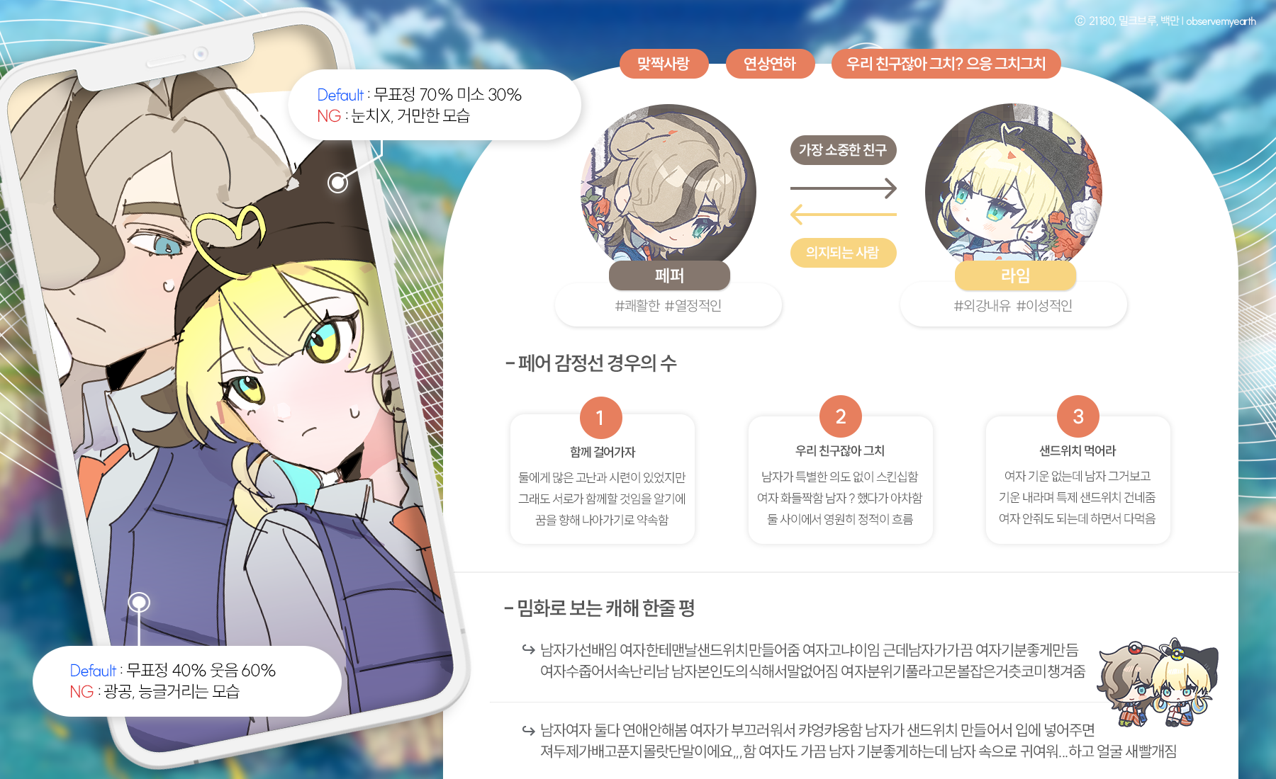 ▷ 캐혐오 발언 <기본적으로 장르 내 모든 캐릭터를 아끼고 좋아합니다. 혹여나 장난이어도 도넘은 캐혐은 보기 힘듭니다.